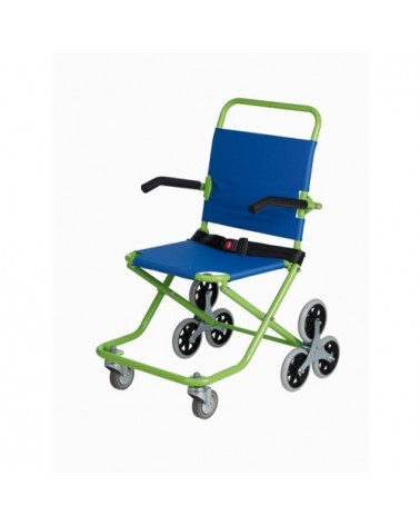 Silla para evacuar personas en caso de emergencia o cuando hay necesidad de trasladar personas por lugares estrechos o de difícil acceso, como por ejemplo de pisos sin ascensor. Para facilitar los traslados y en especial cuando hay bordillos o escalones, la silla viene equipada con ruedas traseras triples y giratorias. Por seguridad debe ser atendida en todo momento por dos personas. Los brazos se abaten simultáneamente. Suministrada con cinturón.